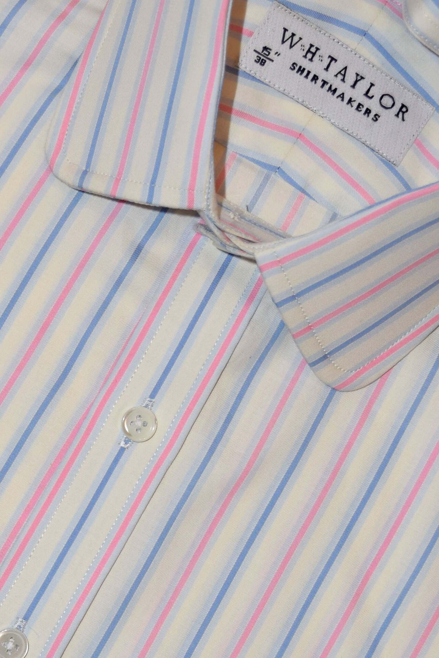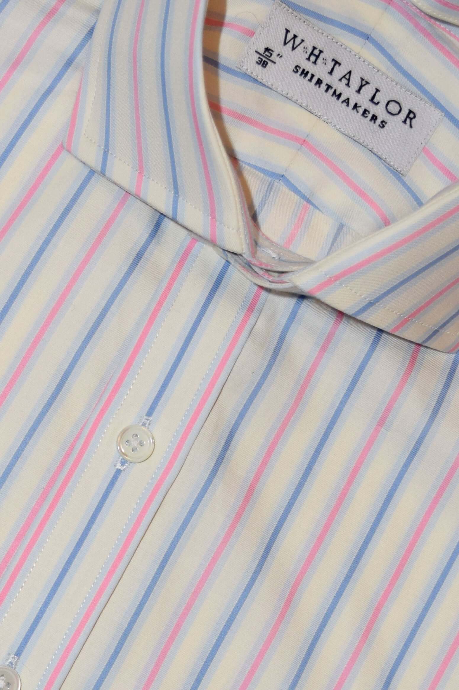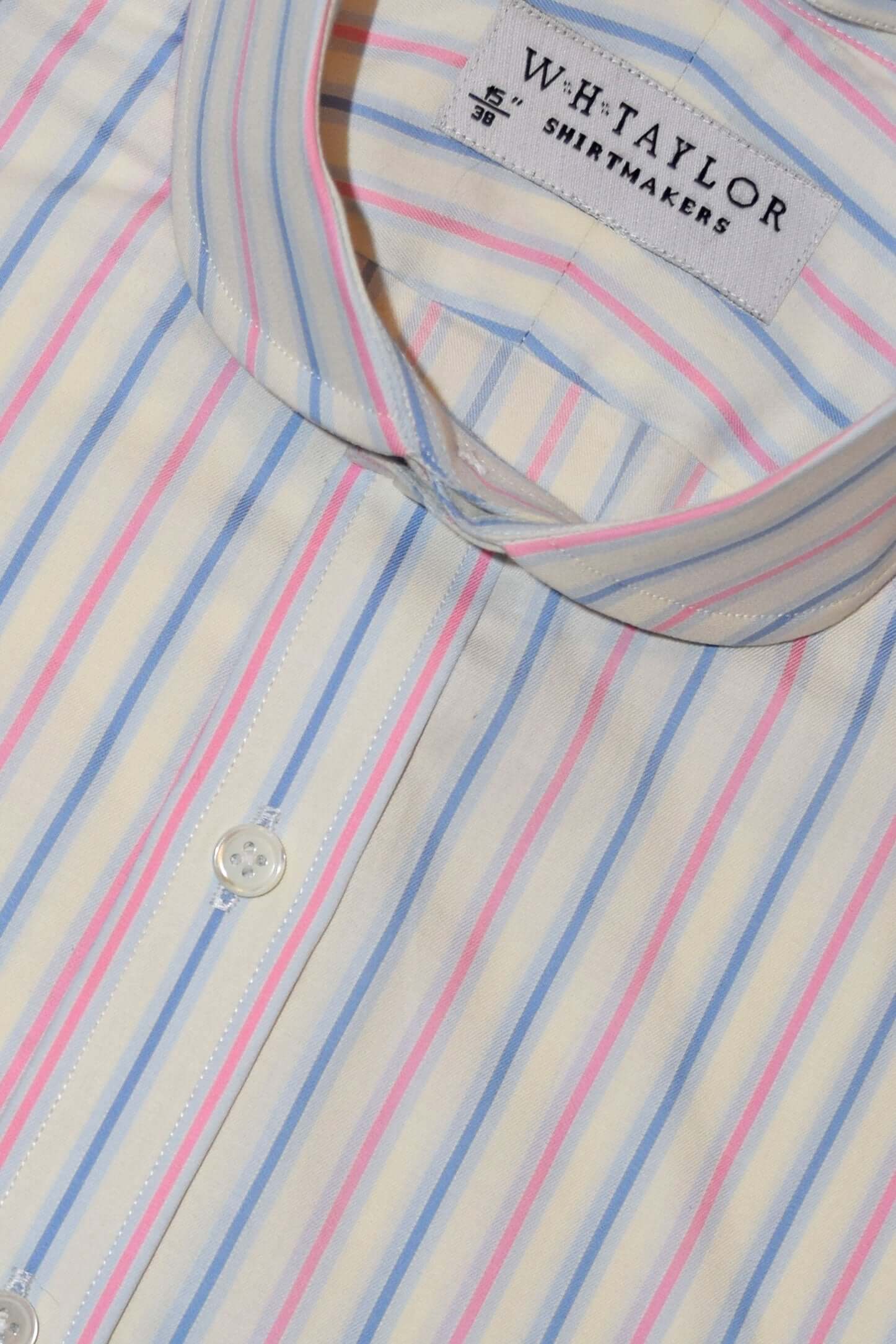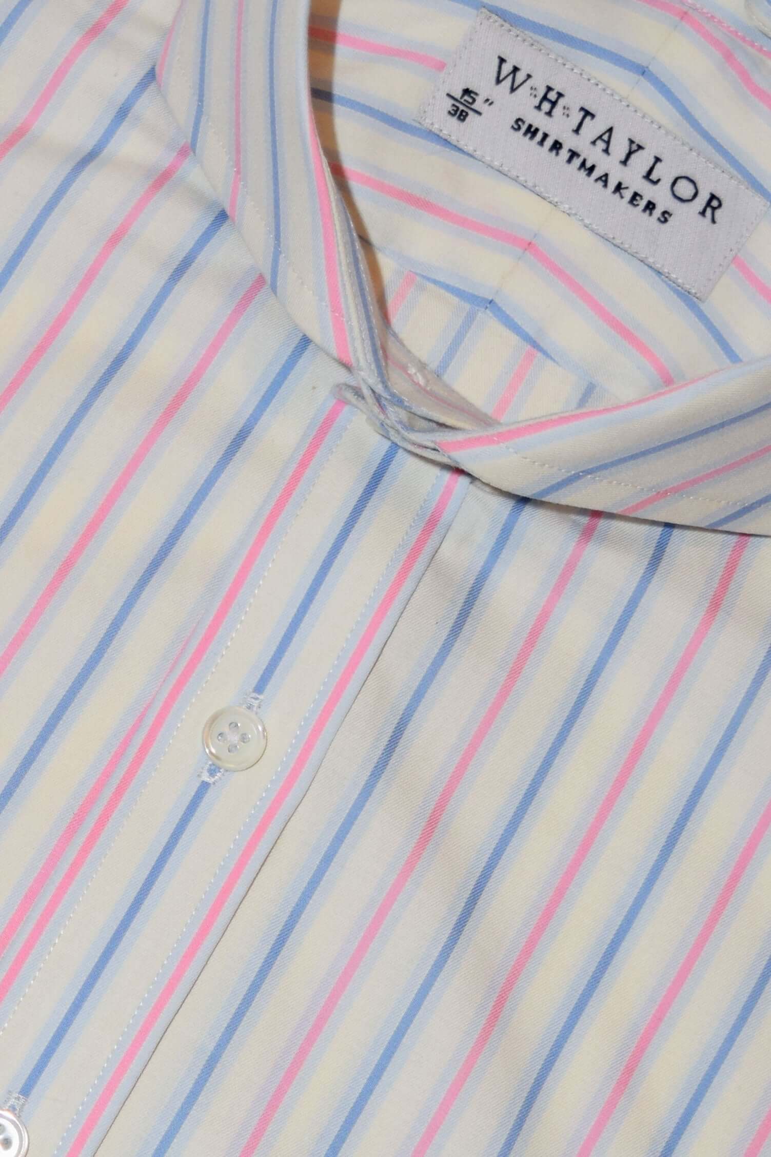Mit seinen abwechselnd dunkelblauen und weiß umrandeten rosa Streifen auf klassischem Blau fügt dieses Hemd definitiv ein interessantes Element zu einem ansonsten gewöhnlichen Look hinzu.
